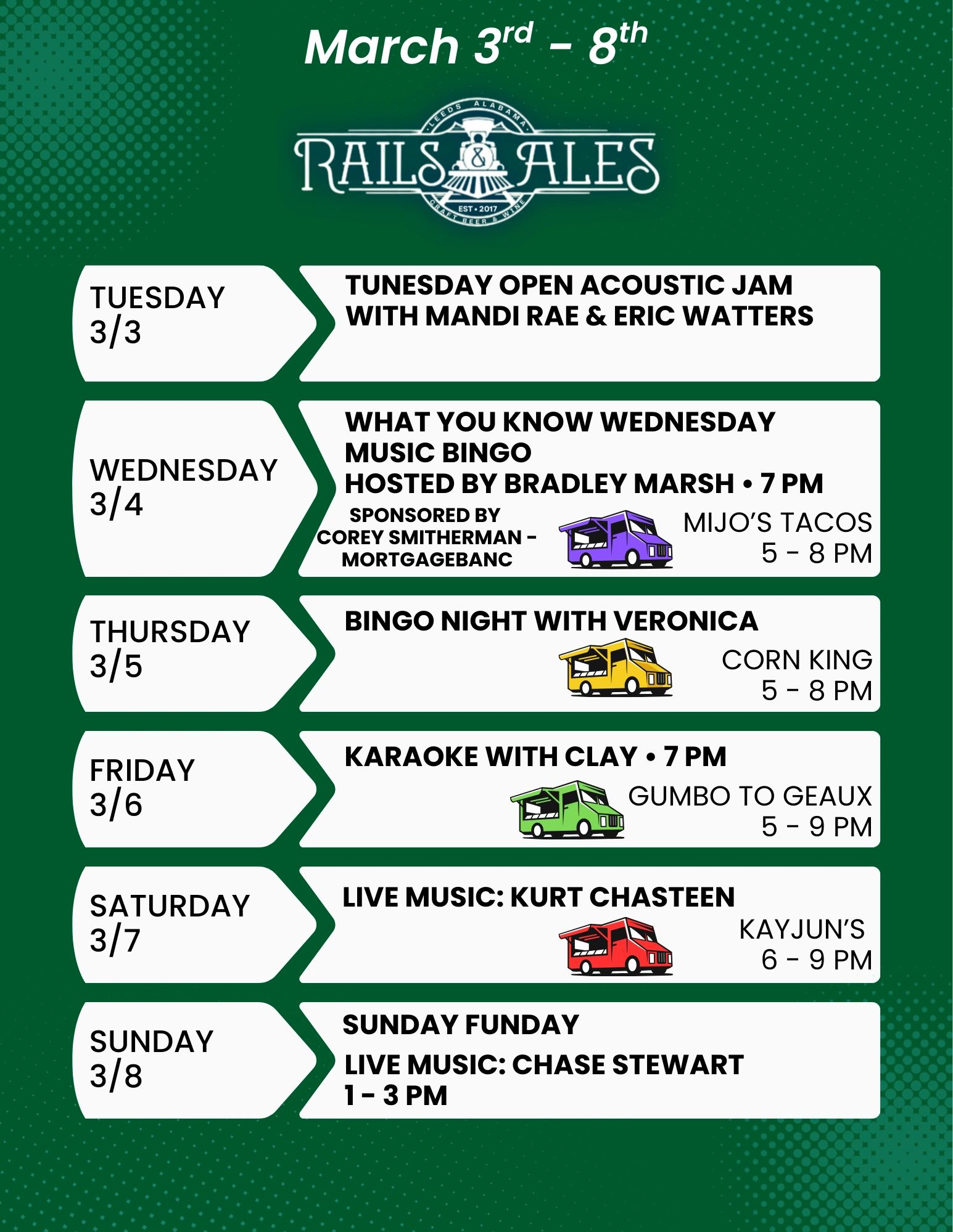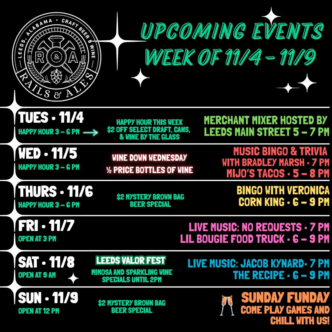 Rails & Ales is a family-friendly, dog friendly, craft beer & wine bar in downtown Leeds, just outside Birmingham, AL. We offer rotating taps, beer flights, food trucks, live music, backyard seating, & event space for parties, showers, & more.